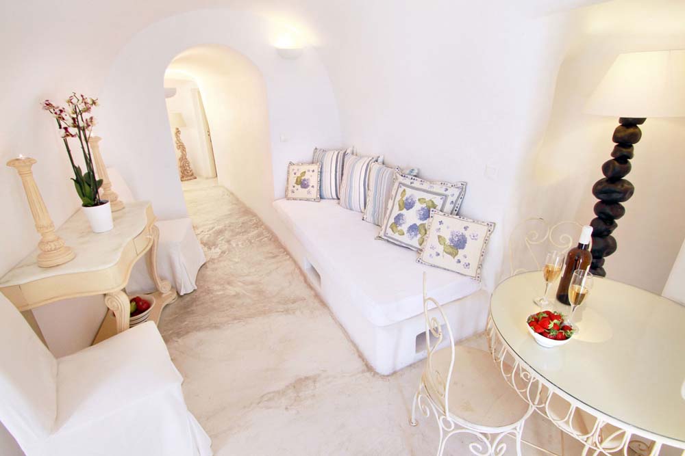 VILLA JASMIN has a charming bedroom with a view to the sea, a separating small living room area with an unfolding couch , a kitchenette and a marble bathroom built like a cave along with a jacuzzi tub. It accommodates three people.
