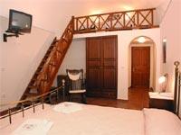 The quadruple room has a spacious bedroom (approx. 20 sq. meters) with a Queen-size bed. There two single beds located in the upper level of the room, which is built according to the traditinal santorinian architecture and style. Nice view to the sea from the balcony make this room a perfect choice for couples, families and honeymooners!!!