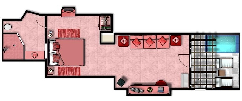 Like a rose pink fairy tale. Young princesses should be the happiest ones in this suite. Designed for honeymoon and romance, located in the middle level of the complex, Rose Suite is spacious enough for the bride to be dressed and get ready for the big day. The bedroom with the Queen Size bed and the white marble pebbles tiled bathroom, gives you the feeling of being in a real princess? room. End your day with a drink in your hot hydro-massage just after a private romantic candle light dinner. Sweet like a cake, Rose Suite, waits for you to light up the pink candles.