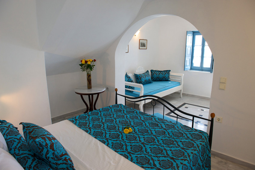 Suite with private balcony and outdoor heated Jacuzzi overlooking the caldera, furnished balcony, some of them with sun loungers in their balconies. Senior Suite consists of sitting area or living room, bedroom with double bed and an all marble bathroom or a mosaic one.