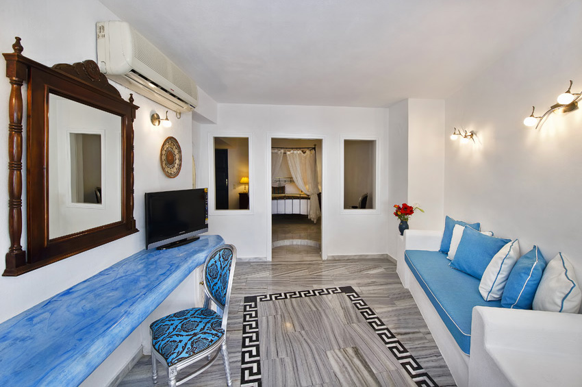 Suite with private balcony and outdoor heated Jacuzzi overlooking the caldera, furnished balcony with sun loungers, table and chairs. Deluxe Suite consists of large living room, bedroom with double bed and an all marble bathroom with indoor Jacuzzi bathtub.