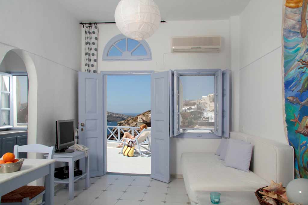 Consisting of a master bedroom equipped with a comfortable queen bed, a living room with two built-in sofas or couch, bathroom with shower and a veranda or a balcony with superb view of the Caldera, the volcano and the deep Aegean blue.