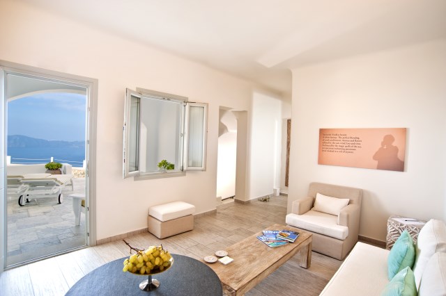 • Terrace with sunbeds, chairs and table with sea and sunset view